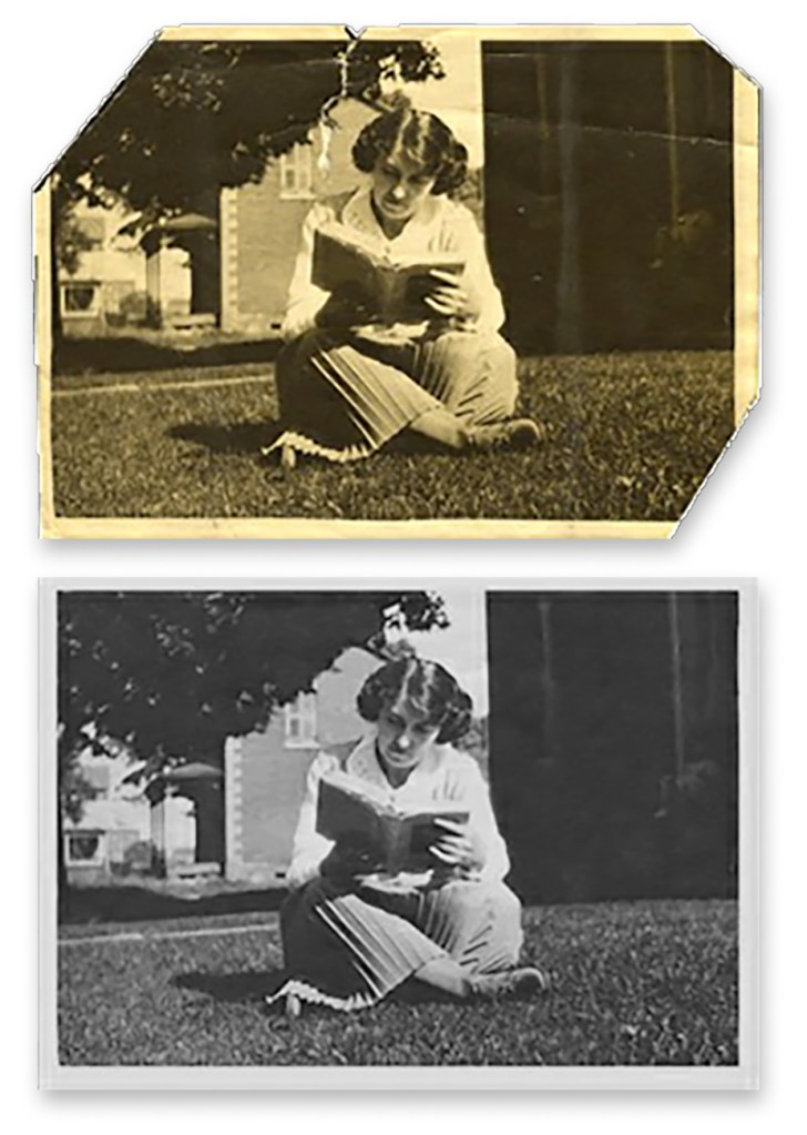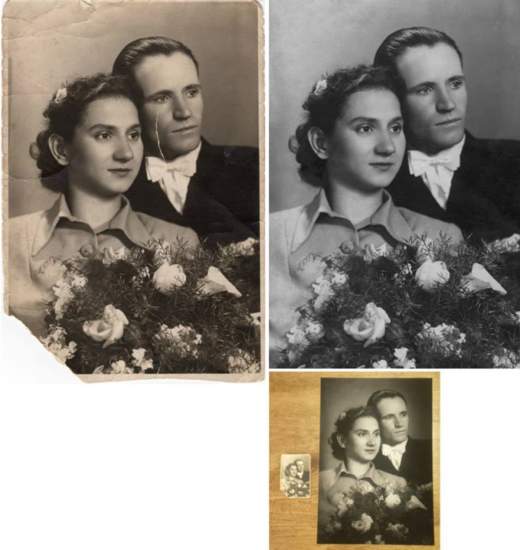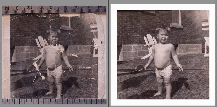 Restoration of damaged photos using Lightroom and Photoshop was a large part of my business. Here you will see samples of repaired photographer’s imprints, creases and tears, fading, and even a full background replacement …